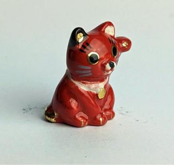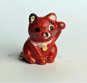 Rot, Gold, Schwarz und Weiß. Diese kunstvoll gestaltete Keramikfigur einer sitzenden roten "Winke Katze" ist ein echter Hingucker für jeden Katzenliebhaber und ein Glücksbringer in einem. Die Figur zeigt die Katze dabei, wie sie mit einer erhobenen Pfote winkt und mit einem rot-goldenen Halsband geschmückt ist.