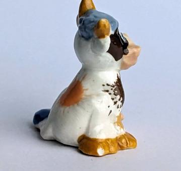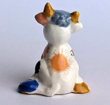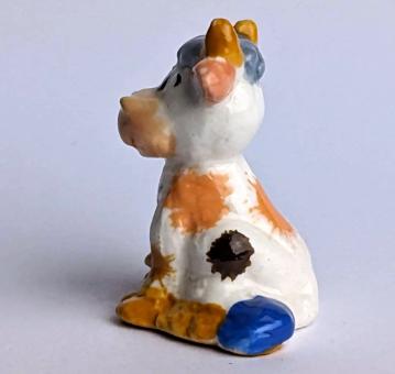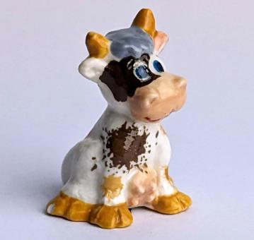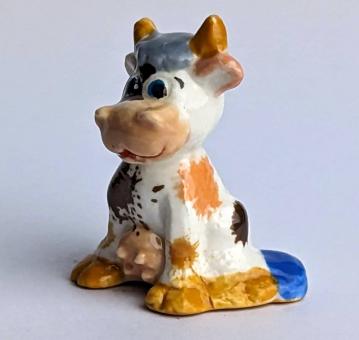 Die Kuh ist in einem natürlichen Farbton gehalten und hat einen blauen Schwanz und hell- und dunkelbraune Kleckse auf ihrem Fell, was ihr einen besonderen und lebendigen Charakter verleiht. Die Haltung der sitzenden Kuh und die Farbkombinationen verleihen der Figur eine besondere und charmante Ausstrahlung.